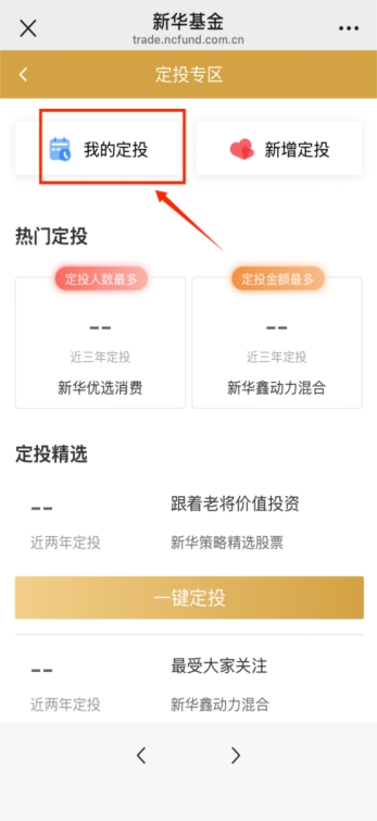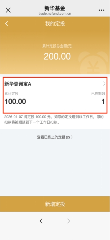 进入我的定投后,就能看到您定投的基金情况,选择您想要修改/暂停/终止的基金,此处以货币型基金“新华壹诺宝”为例,点击该基金。(如下图所示)