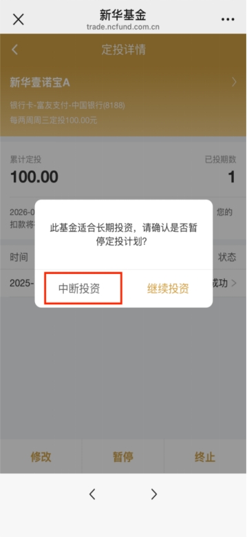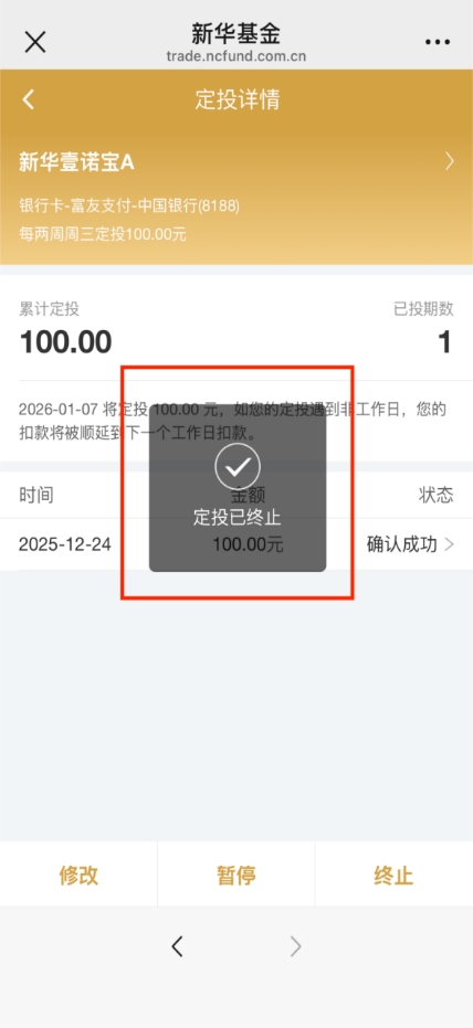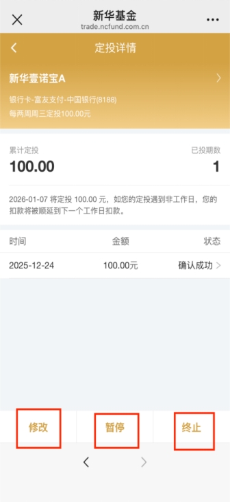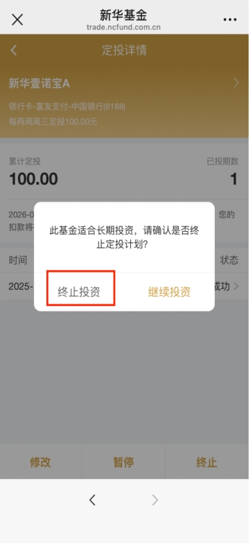 点击“新华壹诺宝”后可看到该基金详细的定投信息,根据您的需求,可以选择下方的“修改”/“暂停”/“终止”。(如下图所示)