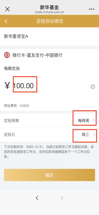 若您想要修改定投方案,则选择“修改”,进入修改页面后,可以根据您的需求,修改每期定投的金额、定投周期以及定投日。(如下图所示)